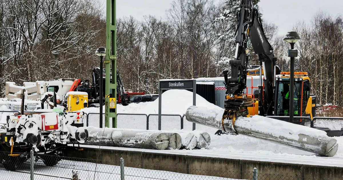 Vid Stenkullens station mellan Lerum och Floda pågår ett omfattande renoveringsarbete på Västra stambanan, en av Sveriges mest trafikintensiva järnvägssträckor. Grävmaskiner lyfter betongfundament till nya kontaktledningsstolpar medan elledningar tas ner från de gröna stolpar som tjänat i närmare hundra år.