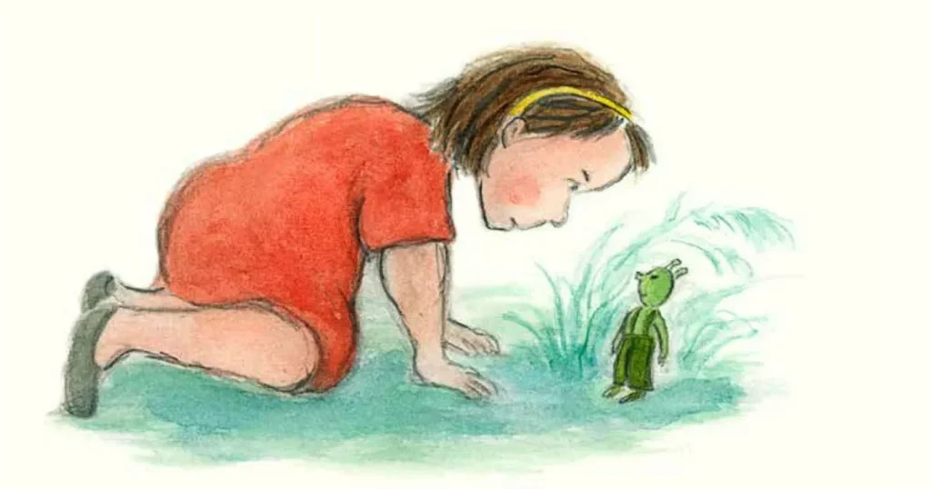 Anna-Clara Tidholms illustrationer skapar en värld där det jordnära och det fantastiska möts. Med färgpennor bygger hon upp ett levande ängslandskap där det kryllar av liv mellan blommor och blad. Här skapas en miljö som både känns realistisk och samtidigt magisk, där gränsen mellan det vardagliga och det sagolika suddas ut.