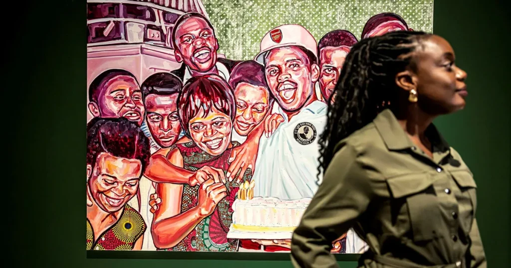 Det är faktiskt bägge. Förlagan till konstnären Esiri Erheriene-Essis oljemålning ”The birthday party” från 2021 är ett foto av den sydafrikanska antivåldsaktivisten och apartheidmotståndaren Steve Biko omgiven av sina nära och kära. Målningen fångar Biko i ett annat sammanhang än det politiska han oftast blir ihågkommen för.