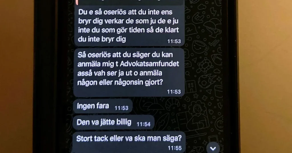Men situationen eskalerade snabbt. Under flera dagar efter det inledande beskedet bombarderades advokaten med meddelanden där klienten krävde kompensation samtidigt som tonen blev allt mer hotfull. I ett av meddelandena skrev klienten: ”Kommer gå på alla nära och kära”.