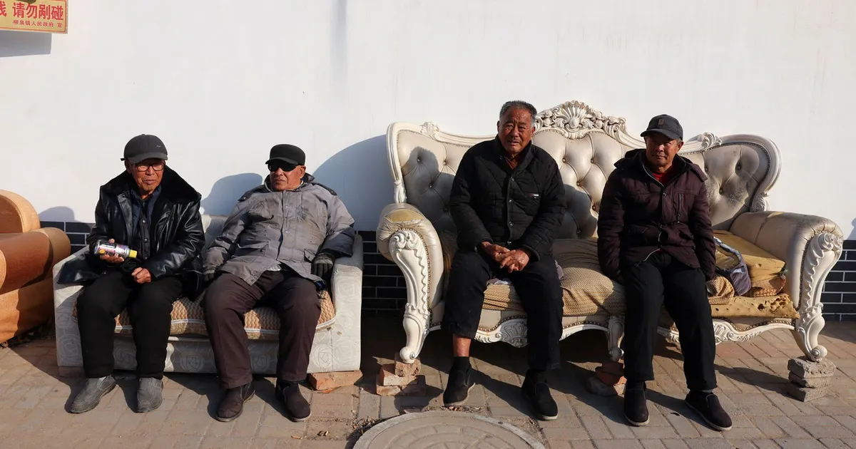 Några män i byn som just ätit frukost sitter påpälsade i soffor utomhus. Vinterns sista dag enligt den gamla kinesiska almanackan närmar sig, och solen börjar äntligen värma igen.