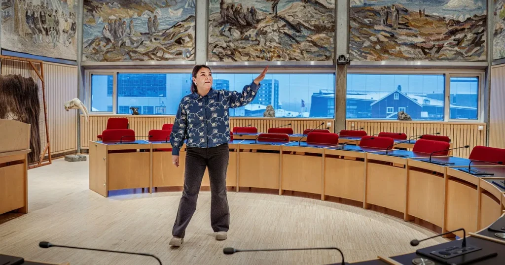 På en storbildsskärm i det grönländska självständighetspartiet Naleraqs konferenslokal direktsänder Danmarks Radio ett pressmöte med USA:s vicepresident JD Vance. ”Tyvärr kommer det här nog att handla om Danmark”, säger den danske tv-kommentatorn. Det får partiledaren Pele Broberg att brista ut i gapskratt.