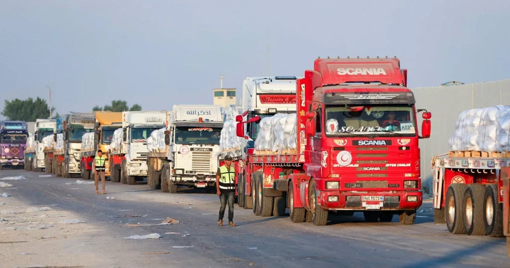 Enligt fredsplanen som tillskrivits tidigare USA-presidenten Donald Trump ska hjälpen vara minst lika omfattande som i avtalet om humanitär hjälp från 19 januari 2025. Detta inkluderar återuppbyggnad av infrastruktur i vid bemärkelse samt andra samhällsviktiga funktioner som sjukhus och bagerier. Distributionen inom Gaza ska enligt avtalet hanteras av Röda halvmånen och andra oberoende organisationer under FN:s ledning, utan inblandning från vare sig Israel eller den Palestinska myndigheten.